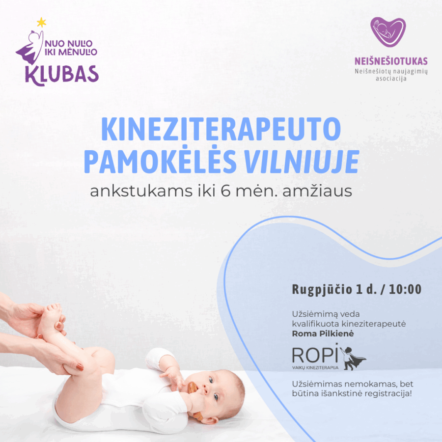 Šeimas į nemokamą praktinį užsiėmimą, tėvams bei neišnešiotukams iki 6mėn. amžiaus. Tai šilta, jauki ir vertinga proga sužinoti, kaip padėti savo mažyliui stiprėti namuose – paprastai, saugiai ir žaismingai! Šį praktinį užsiėmimą Vilniuje ves vaikų kineziterapeute Roma Pilkiene, kurios moto – mažais žingsneliais į dideles pergales!