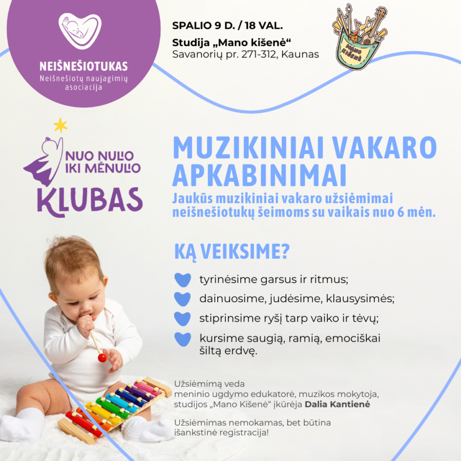 🔔  Svarbu: Užsiėmimas gali būti fotografuojamas, o nuotraukomis dalijamasi su Neišnešiotuko bendruomene.